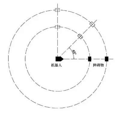 D. 將障礙物放置在相對(duì)于機(jī)器人的視線逆時(shí)針45°方向的直線上,重復(fù)步驟B和C。每次測(cè)量完成后,逆時(shí)針增加45°角,重復(fù)步驟D。當(dāng)機(jī)器人到達(dá)初始位置時(shí),程序停止。調(diào)整障礙物的方向,使其大的一面面向機(jī)器人。通過(guò)移動(dòng)機(jī)器人代替障礙物,可以實(shí)現(xiàn)障礙物的相對(duì)定位。
