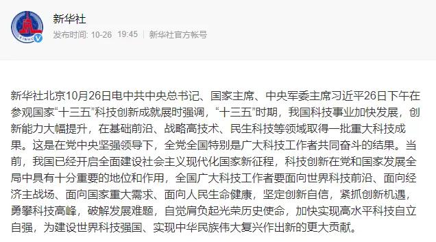 10月26日,總書記在參觀國家“十三五”科技創新成就展時強調,“十三五”時期,我國科技事業加快發展,創新能力大幅提升,在基礎前沿、戰略G技術、民生科技等L域取得一批重大科技成果。這是在黨堅強L導下,全黨全國特別是廣大科技工作者共同奮斗的結果。當前,我國已經開啟多面建設社會主義現代化國家新征程,科技創新在黨和國家發展全局中具有十分重要的地位和作用,全國廣大科技工作者要面向世界科技前沿、面向經濟主戰場、面向國家重大需求、面向人民生命健康,堅定創新自信,緊抓創新機遇,勇攀科技G峰,破解發展難題,自覺肩負起光榮歷史使命,加快實現G水平科技自立自強,為建設世界科技強國、實現中華民族偉大復興作出新的更大貢獻。